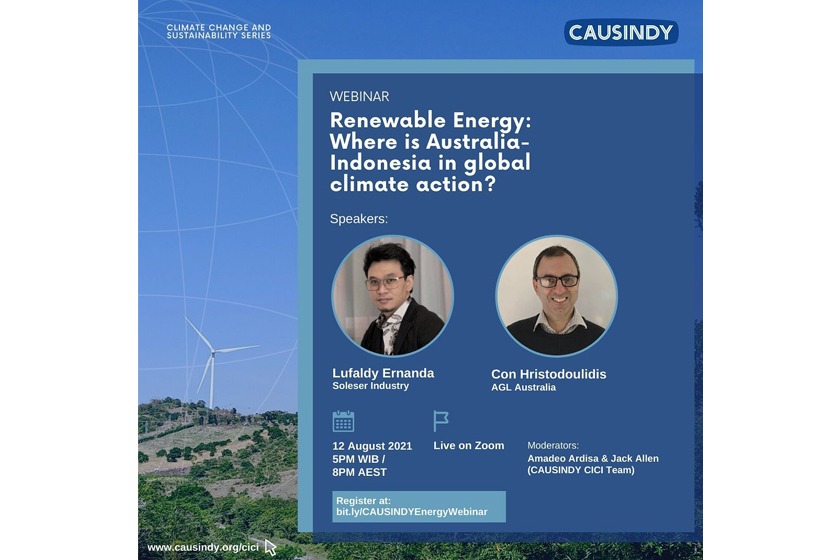 Join this first ever online #CAUSINDYCCS Series in 2021, with the topic of “Renewable Energy: Where is Australia-Indonesia in global climate action?” on Thursday, 12 August 2021 at 5:00 PM WIB / 8:00 PM AEST!
