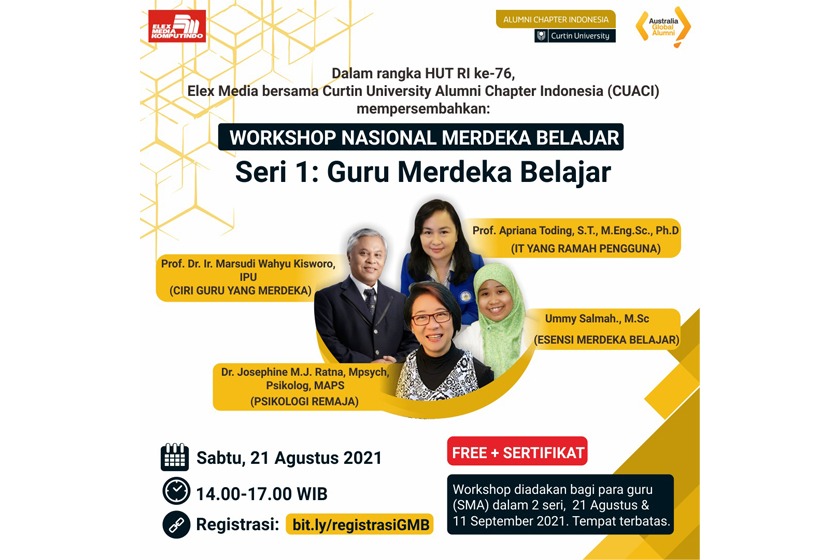 As part of a celebration for Indonesia’s Independence Day, the Curtin University Alumni Chapter Indonesia (CUACI) in collaboration with Elex Media Komputindo, and supported by the Australia Global Alumni in Indonesia, is inviting you to join their Merdeka Belajar National Workshop #1: “Guru Merdeka Belajar” on Saturday, 21 August 2021 at 02.00 PM WIB / 05.00 PM AEST.