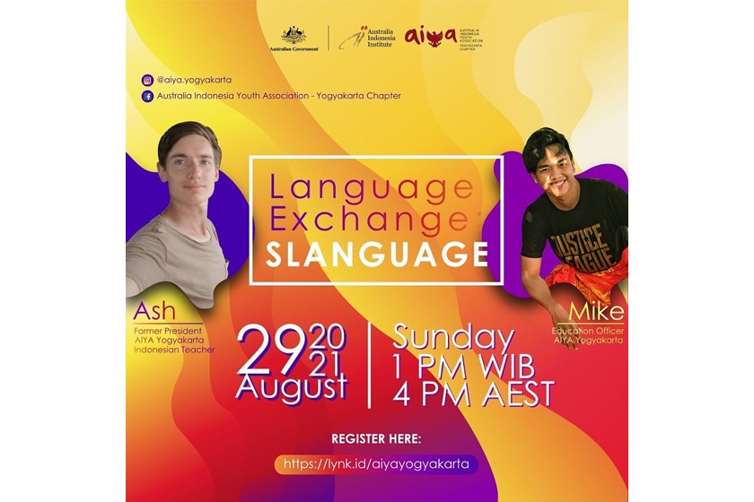 This event will be held on 29 August 2021 at 01:00 PM WIB / 04.00 PM AEST, and will be providing you a space to help improve your English skills, and this is going to be special because they will talk about Slang!