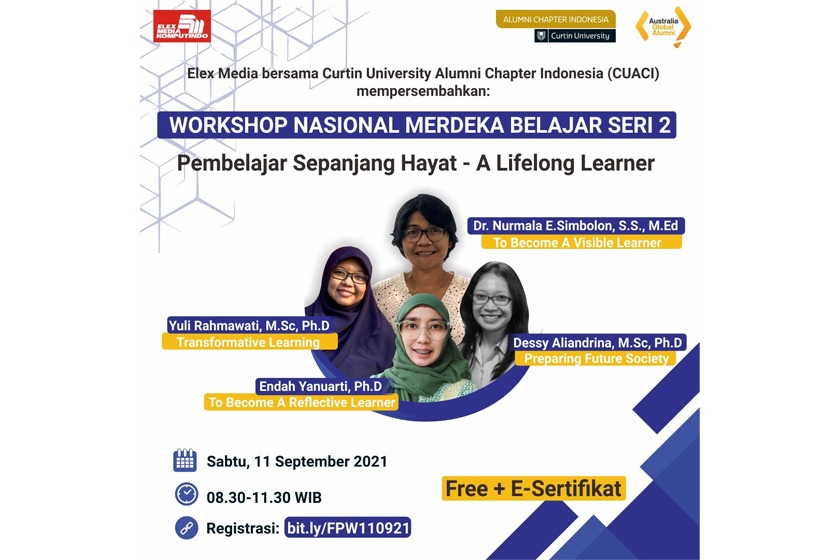 As a form of appreciation to teachers in Indonesia, Elex Media together with Curtin University Alumni Chapter Indonesia (CUACI), supported by Australia Global Alumni in Indonesia present “Merdeka Belajar (Freedom of Learning) National Workshop – Session 2: A Lifelong Learner”, which will be held on Saturday, 11 September 2021, at 08.30 AM WIB / 11.30 AEST, and will feature several speakers including: