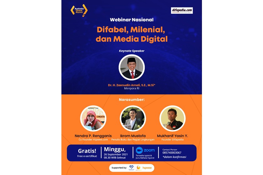 Difapedia, hipwee, Mata Garuda, and Health Line, supported by Australia Global Alumni, present the national webinar of "Difabel, Millenial & Media Digital", which will be held on Sunday, 26 September 2021, starting at 08.30 AM.