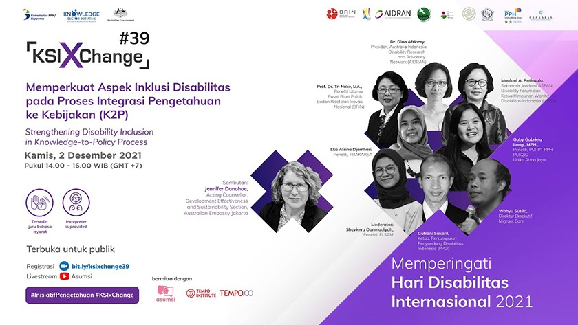 Watch this recorded webinar held by Knowledge Sector Initiative (KSI) here, which featured several experts including representatives from Australia Indonesia Disability Research and Advocacy Network (AIDRAN), Association of Indonesian Persons with Disabilities (PPDI), Migrant Care, etc.
