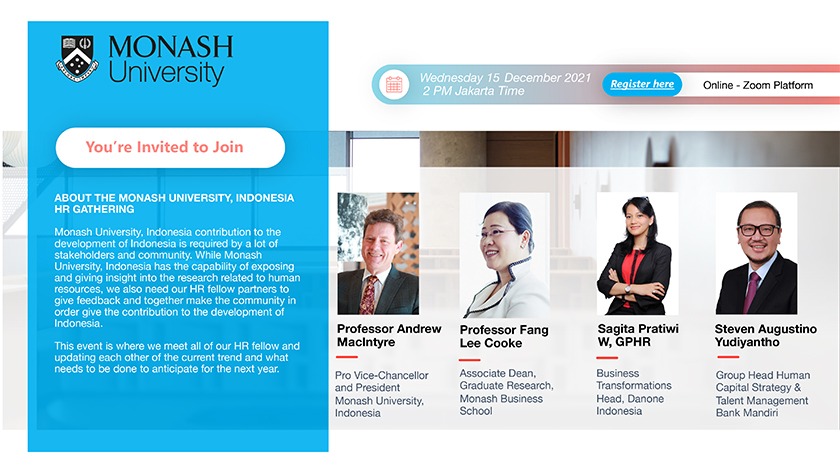 Calling all HR Professionals to attend the first Monash Indonesia HR Gathering with the topic of "HR Trends 2022 – Post Pandemic Era" – on Wednesday, 15 December 2021 at 2.00 PM Jakarta time.