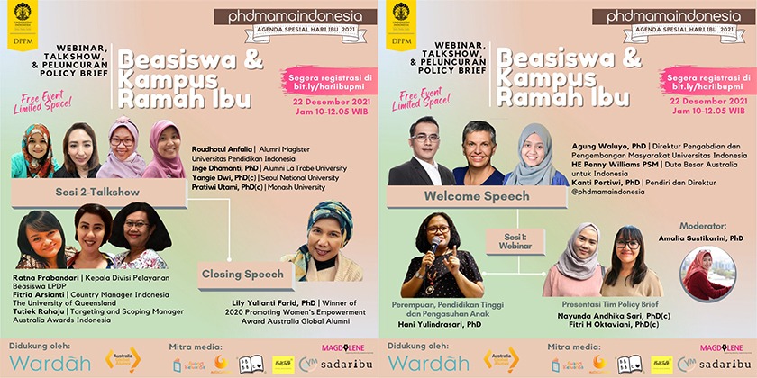 In commemoration of Mother's Day, they will present and discuss their research findings at the webinar, talk show, and launch the policy brief "Mother-Friendly Scholarships and Campuses" on 22 December 2021 at 10.00 AM WIB via Zoom.