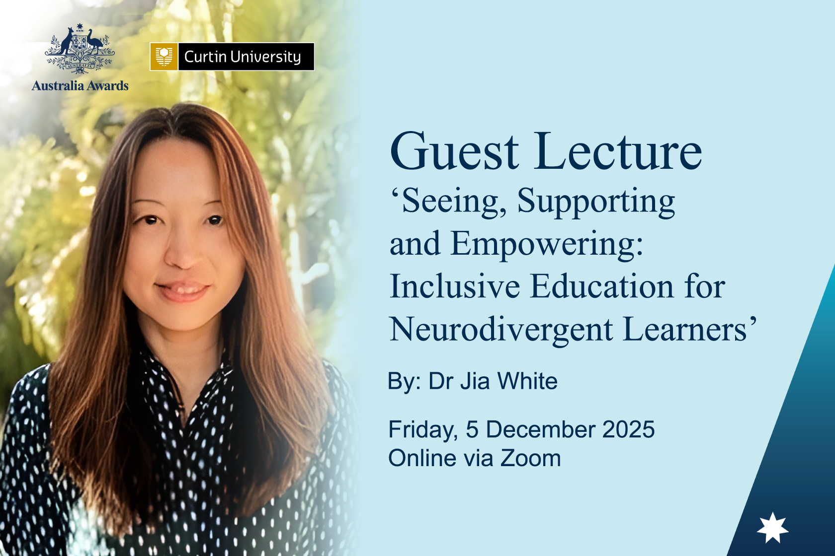 Join us for the online guest lecture, ‘Seeing, Supporting and Empowering: Inclusive Education for Neurodivergent Learners’, delivered by Dr Jia White from Curtin University, on Friday, 5 December 2025, from 1:45pm to 4:00pm (Jakarta time).